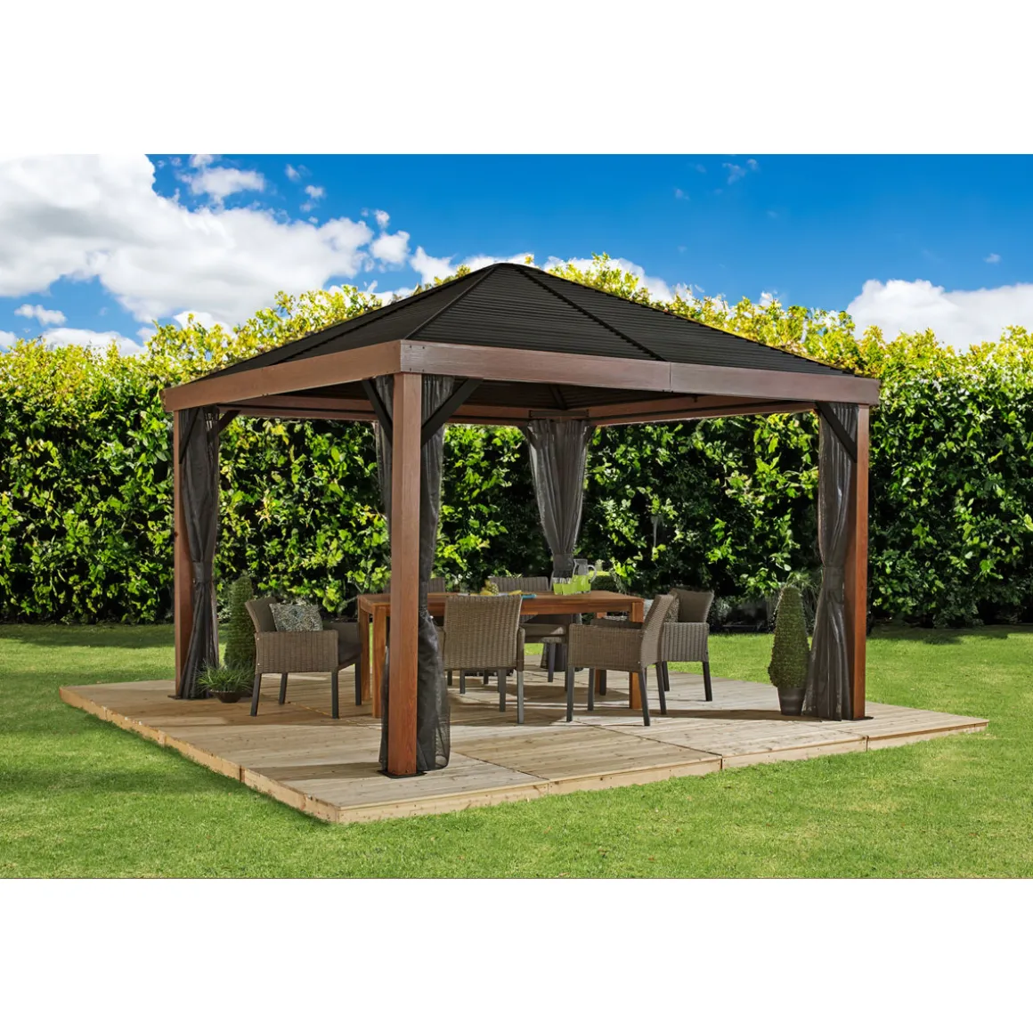 Besonderheiten: * Massive quadratische Pfosten * Edle und moderne „Holzoptik“ * Einzigartiges Spitzdach mit Riffelung * Inklusive Moskitonetzen * Parallele Nutzung von Moskitonetzen und Vorhängen * Für den ganzjährigen Außenbetrieb entwickelt
