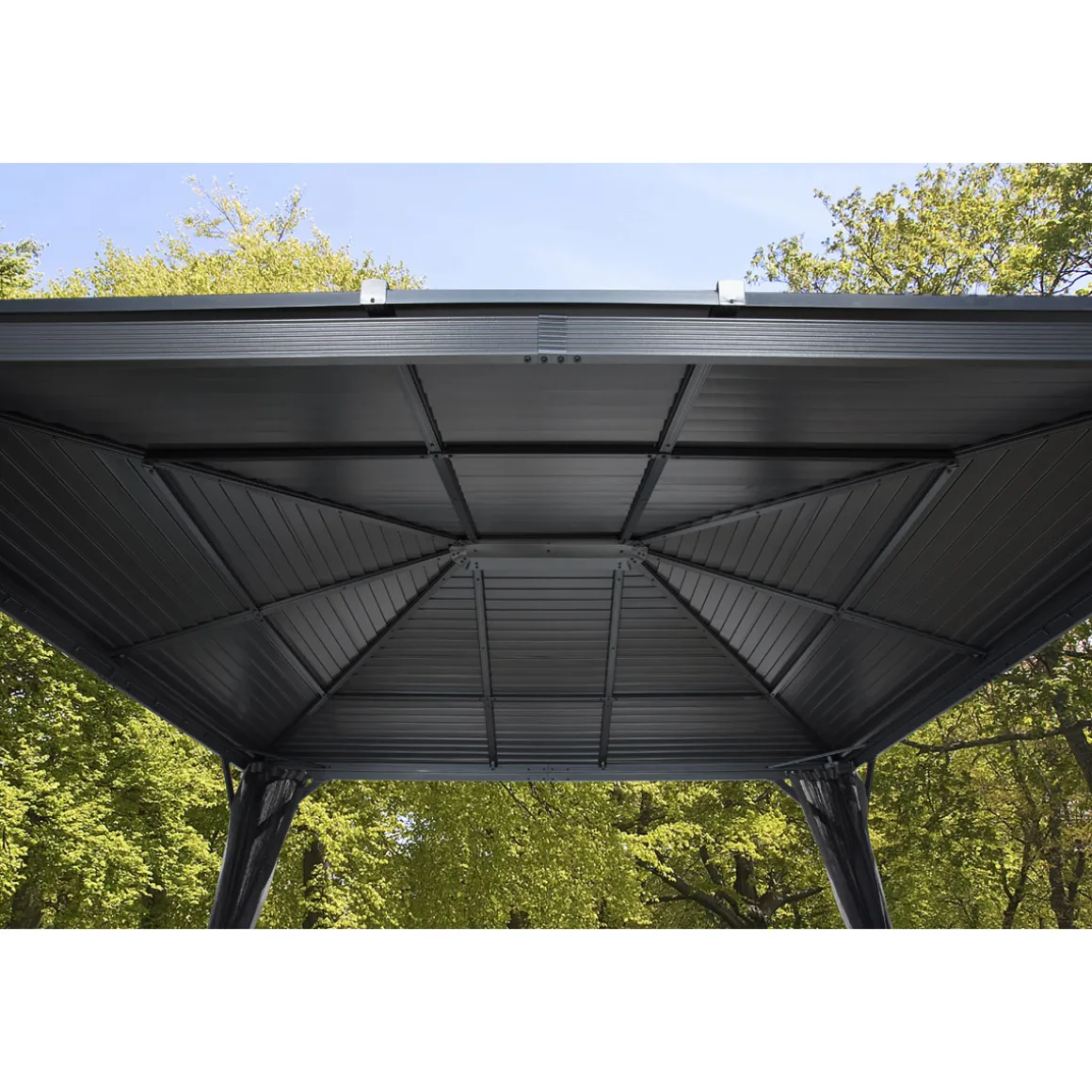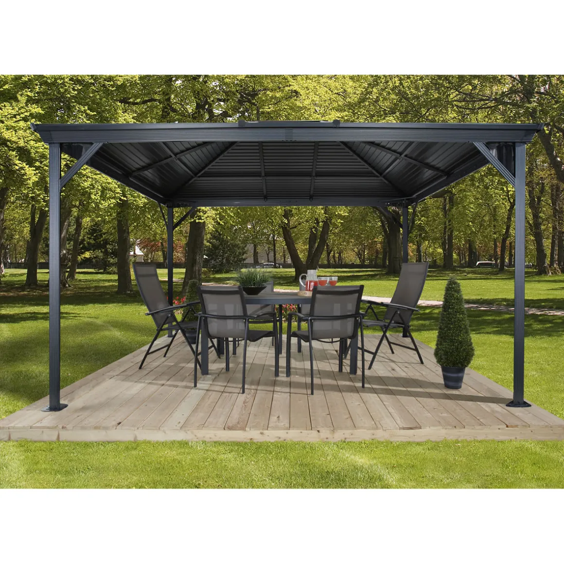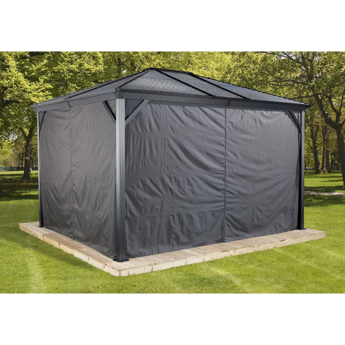 Kanadas Nr. 1 in Pavillons SOJAG Premium Aluminium Pavillon Ventura 10×10 mit Hard-Top Modern, langlebig und eine tolle Optik sind Merkmale der neuen Aluminiumpavillons vom größten und bekanntesten kanadischen Pavillon Produzenten SOJAG. Der wesentliche Unterschied zu anderen Pavillons liegt im Material des Daches. Hier wird anstelle von Kunststoffplatten oder Stoff langlebiger und ständig formschöner Stahl verwendet. Außergewöhnliche 125kg/m² Schneelast und 100% dauerhaft rostfrei! Durch die galvanische Beschichtung rostet das Dach nicht, ist zudem wasserdicht und hält Witterungen wie Regen, Schnee oder Sonne problemlos Stand. Das gleiche gilt für die massive Konstruktion aus resistentem, pulverbeschichtetem Aluminium (Pfostenstärke 7,6cm). Selbst die Schrauben bestehen aus rostfreiem Edelstahl. Der Pavillon muss daher im Winter nicht abgebaut werden. Das Modell Ventura ist in einem edlen Basaltgrau gehalten. Optisch passende Vorhänge (Dunkelgrau) sind seperat erhältlich. Der Aufbau ist unkompliziert und kann durch 2 Personen mit Hilfe der detaillierten Schritt-für-Schritt Anleitung sowie handelsüblichen Werkzeugen durchgeführt werden. Für den Aufbau sollten circa 4-5 Stunden eingeplant werden. Die Füße der Pfosten besitzen jeweils 3 Bohrungen. Das bedeutet, Sie benötigen zur Befestigung am Boden 12 Schrauben und Dübel. Als Untergrund für den Pavillon empfehlen wir eine ebene Fläche aus Holz, Beton oder Pflastersteinen. Ein Schraubenkit zur Verankerung am Boden wird nicht mitgeliefert.
