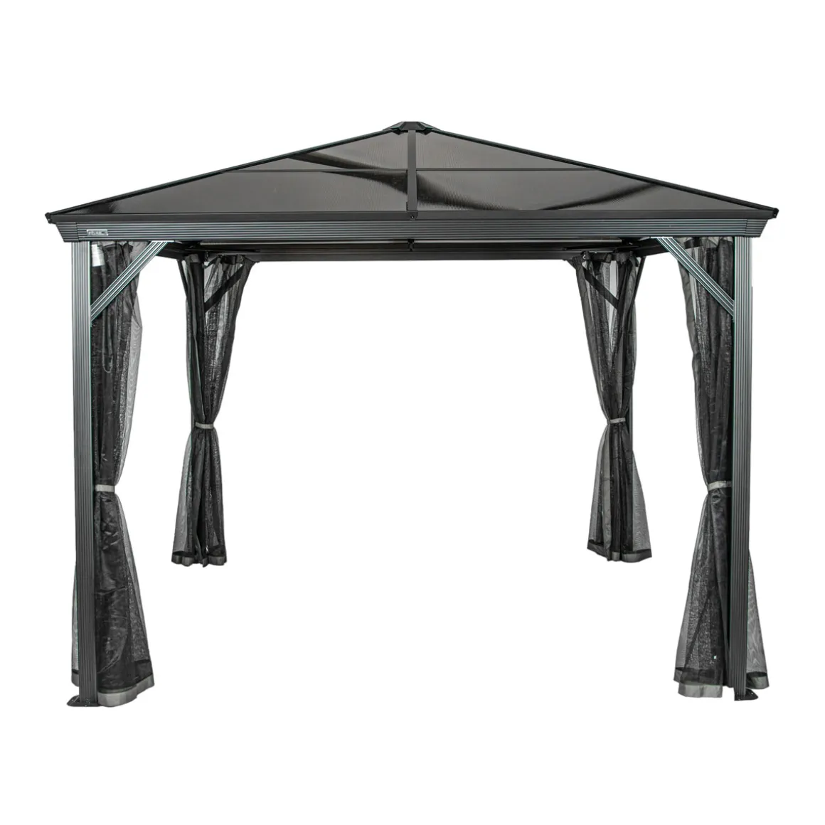 Besonderheiten: * Massive Konstruktion * Witterungsbeständig * Konzipiert für hohe Schneelasten von 125 kg/m² * Inkl. Moskitonetzen * Parallele Nutzung von Moskitonetzen und Vorhängen * Für den ganzjährigen Außenbetrieb entwickelt * Fußmaß: 20,30×16,30 cm