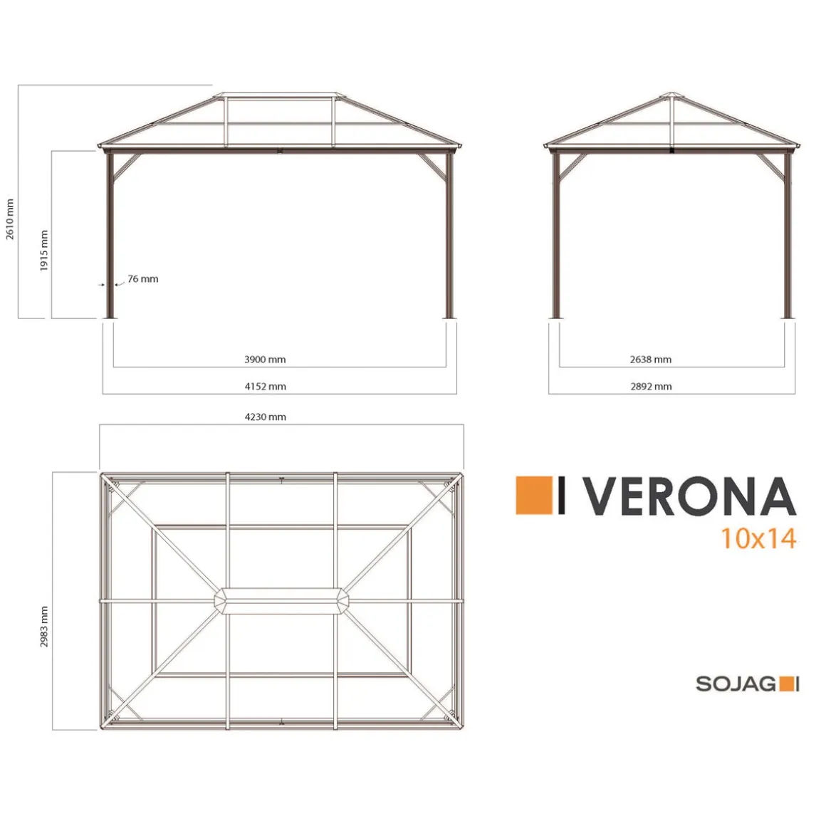 Kanadas Nr. 1 in Pavillons SOJAG Aluminium Pavillon Verona 10×14 mit HardTop Modern, langlebig und eine tolle Optik sind Merkmale für die neuen Aluminiumpavillons vom größten und bekanntesten kanadischen Pavillon Produzenten SOJAG. Außergewöhnliche 125 kg/m² Schneelast und alle Aluminiumteile dauerhaft rostfrei! Das Dach besteht aus 6mm starken Doppelsteglatten, ist wasserdicht und hält Witterungen wie Regen, Schnee oder Sonne (UV) problemlos Stand. Das gleiche gilt für die massive Konstruktion aus resistentem, pulverbeschichtetem Aluminium (Pfostenstärke 7,6 cm). Inklusive Moskitonetzen aus Nylon und zweigleisigen Laufschienen zur zusätzlichen Anbringung von Vorhängen (separat als Zubehör erhältlich). Im Gegensatz zu anderen Modellen gilt hier nicht entweder das Eine oder das Andere, sondern hier können sowohl Moskitonetze (bereits inbegriffen) und gleichzeitig Vorhänge genutzt werden. Der Pavillon Verona kommt in edlen Anthrazit Farbton. Optisch passende Vorhänge (Dunkelgrau) separat erhältlich. Einfacher Aufbau durch 2 Personen mit Hilfe von handelsüblichen Werkzeugen sowie einer detaillierten Schritt-für-Schritt Anleitung. Aufbauzeit ca. 4-5 Stunden. Die Füße besitzen jeweils 3 Bohrungen, dass heißt, Sie benötigen zur Befestigung am Boden 12 Schrauben und Dübel. Als Untergrund empfehlen wir eine ebene Fläche aus Holz, Beton oder Pflastersteinen. Schraubenkit zur Verankerung am Boden wird nicht mitgeliefert.