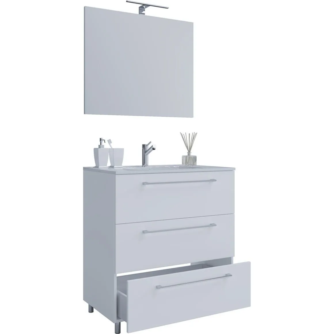 Das Badmöbel-Set besteht aus einem Unterschrank mit drei leichtgängigen Schubladen mit Metallauszügen.Ein modernes Waschbecken aus massiver Keramik und einem Spiegel aus strapazierfähigem Glas runden das Möbel ab, um den perfekten Blickfang im Badezimmer zu erhalten.Waschtisch-Unterschrank: