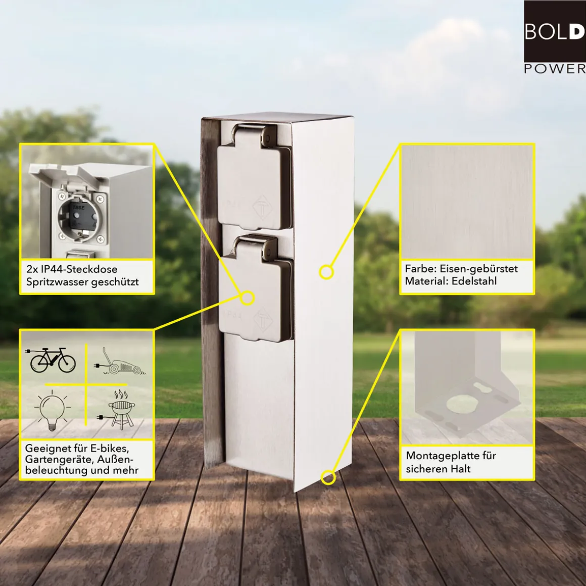 Bold Steckdosensäule ORIO 2fach IP44 Eisen-gebürstet – Stilvoller Strom für Ihren Außenbereich