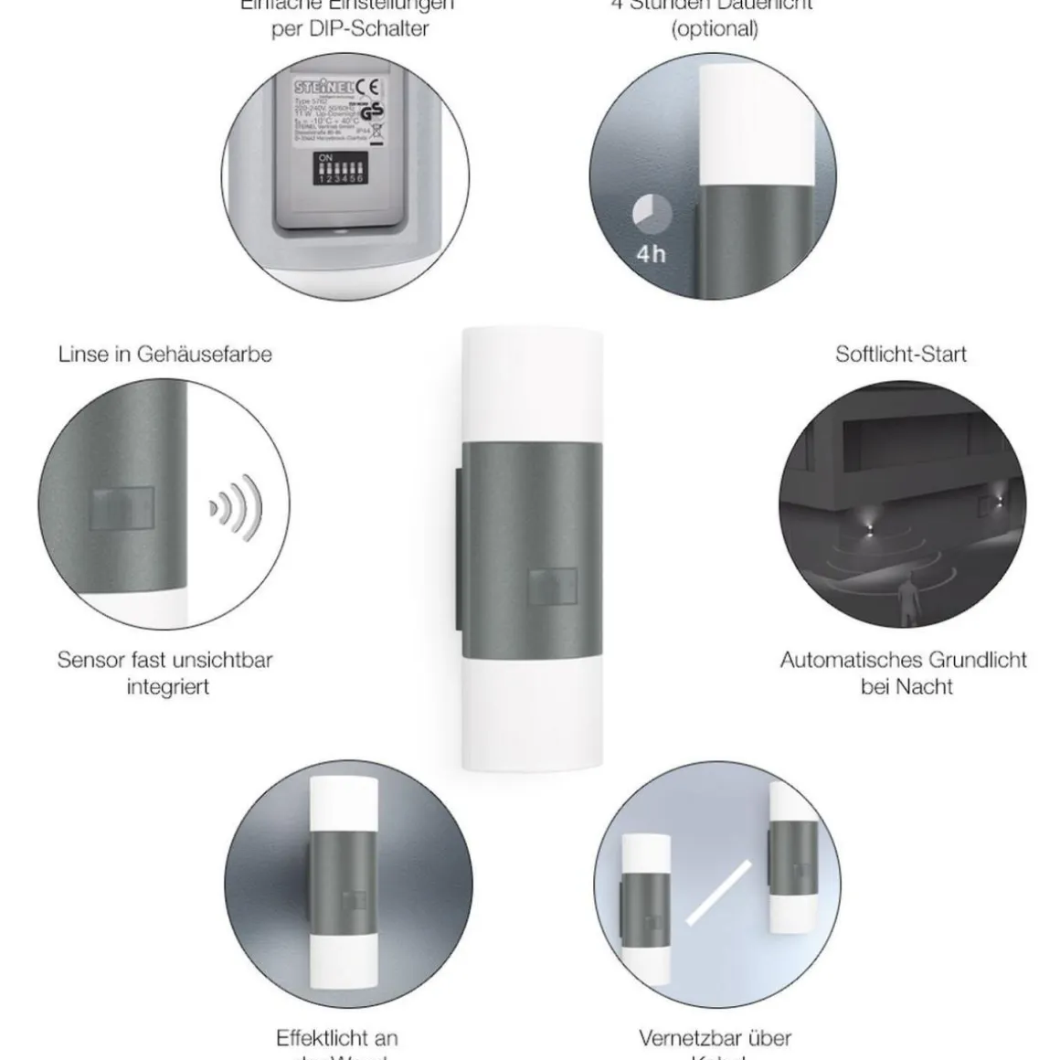 Die Steinel LED-Sensor-Außenleuchte L 910 S Up-/Downlight anthrazit ist die perfekte Wahl für moderne Hausbesitzer, die eine stilvolle und praktische Beleuchtung für ihren Garten, ihre Zu- und Ausfahrt oder ihren Eingangsbereich suchen. Mit ihrem hochwertigen Aluminiumgehäuse in Anthrazit und dem weißen Kunststoffschirm fügt sich diese Leuchte nahtlos in jede Umgebung ein.