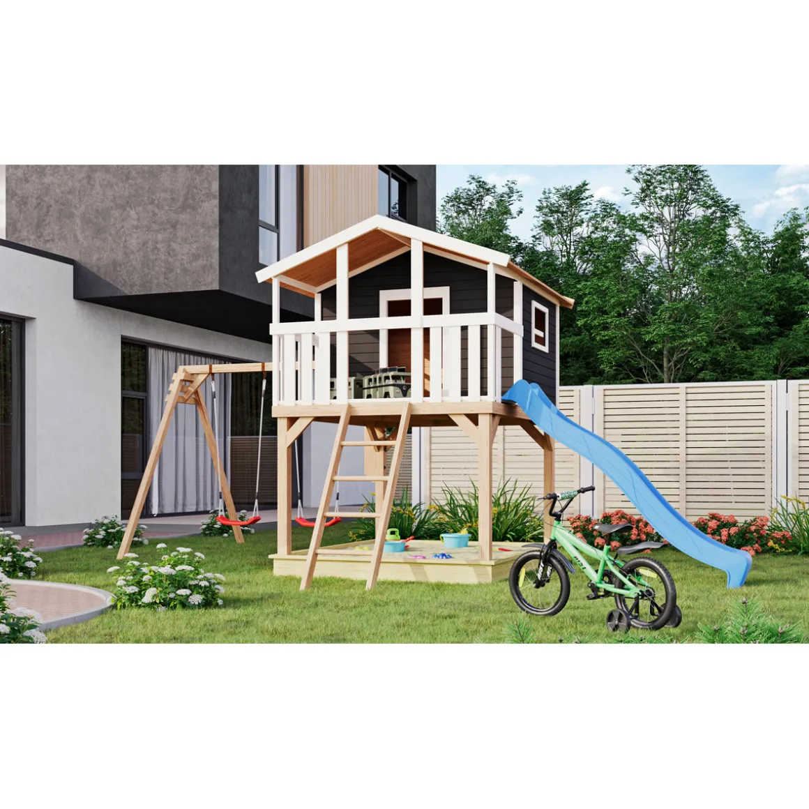 - Inklusive Doppelschaukel und Rutsche für vielseitigen Spielspaß im eigenen Garten