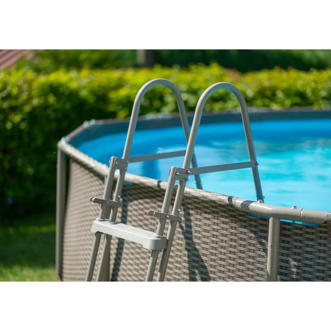 Summer Waves Active Frame Pool Aufstellpool rund inkl. Zubehör Rattanoptik braun Ø 457×107 cm Du hast an heißen Sommertagen Lust auf abkühlende Erfrischung im heimischen Garten? Der runde Summer Waves Active Frame Aufstellpool vereint unkompliziertes Handling mit klassischem Pooldesign und verwandelt deinen Garten im Handumdrehen in eine sommerliche Pooloase. Unkomplizierter Aufbau für schnellen Poolspaß! Durch das innovative Snap-in System ist der Pool im Nu aufgebaut. Die hochwertigen Rahmenrohre aus Metall gewährleisten in Verbindung mit der strapazierfähigen Poolfolie aus einem 3-lagigen PVC-Polyester-Mix eine hohe Widerstandsfähigkeit und Stabilität. Die Highlights auf einen Blick: * Poolset mit viel Zubehör * Robuste Poolkonstruktion für langanhaltenden Badespaß * Maximale Stabilität durch massive Stahlrohr-Konstruktion * Hohe Belastbarkeit dank 3-lagiger PVC-Polyester-Mix Folie * Schneller und einfacher Aufbau durch Snap-in Verfahren * Füllmenge bei 90 %: 15.297 Liter Platz für ca. 7 Personen * Moderndes Design in Rattanoptik kombiniert mit Mosaikmuster Maximale Sauberkeit dank zuverlässiger Technologie! Die mitgelieferte SkimmerPlus 2-in-1 Filterpumpe reinigt das Wasser effektiv und sorgt für klare Verhältnisse. Oberflächenablagerungen werden kontinuierlich durch die Abschöpftechnologie entfernt, sodass du den ganzen Sommer über kristallklares Wasser genießen kannst. Im Lieferumfang enthalten: * SkimmerPlus 2-in-1 Filterpumpe inkl. Filterpatrone * Abdeckplane * Einstiegsleiter Erlebe Badespaß pur und spritzige Abkühlung mit dem Summer Waves Active Frame Pool!