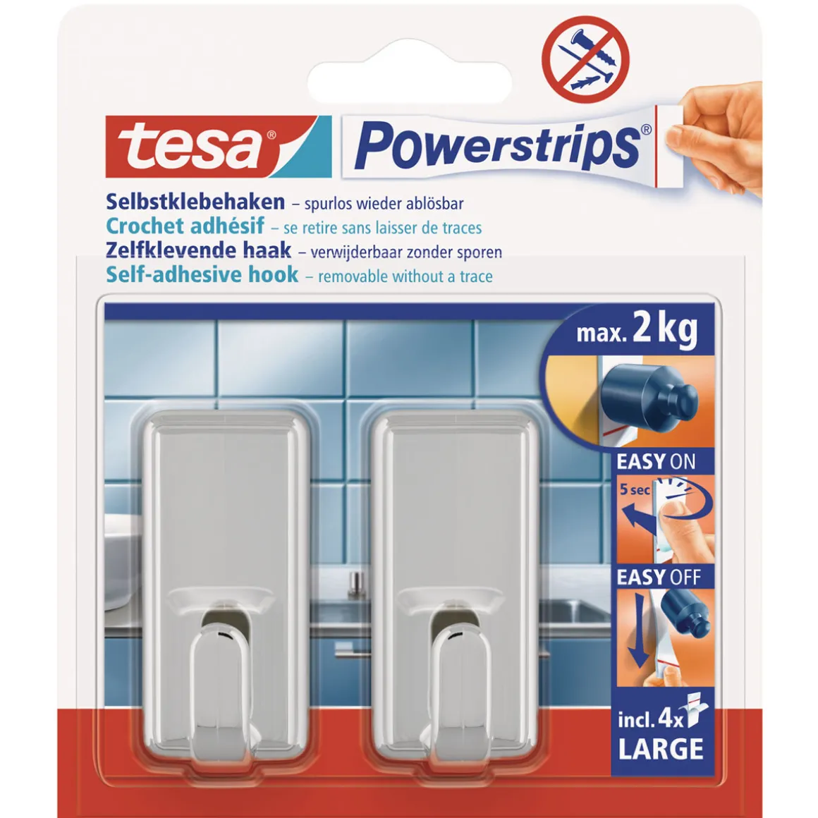 Mit den Tesa Systemhaken classic chrom können Sie Gegenstände bis zu einem Gewicht von 2 kg einfach und spurlos anbringen. Dank des selbstklebenden Kunststoffmaterials benötigen Sie keine Hilfsmittel oder Werkzeuge. Die Haken sind geeignet für eine Vielzahl von Oberflächen wie Kacheln, Glas, Holz oder Kunststoff.