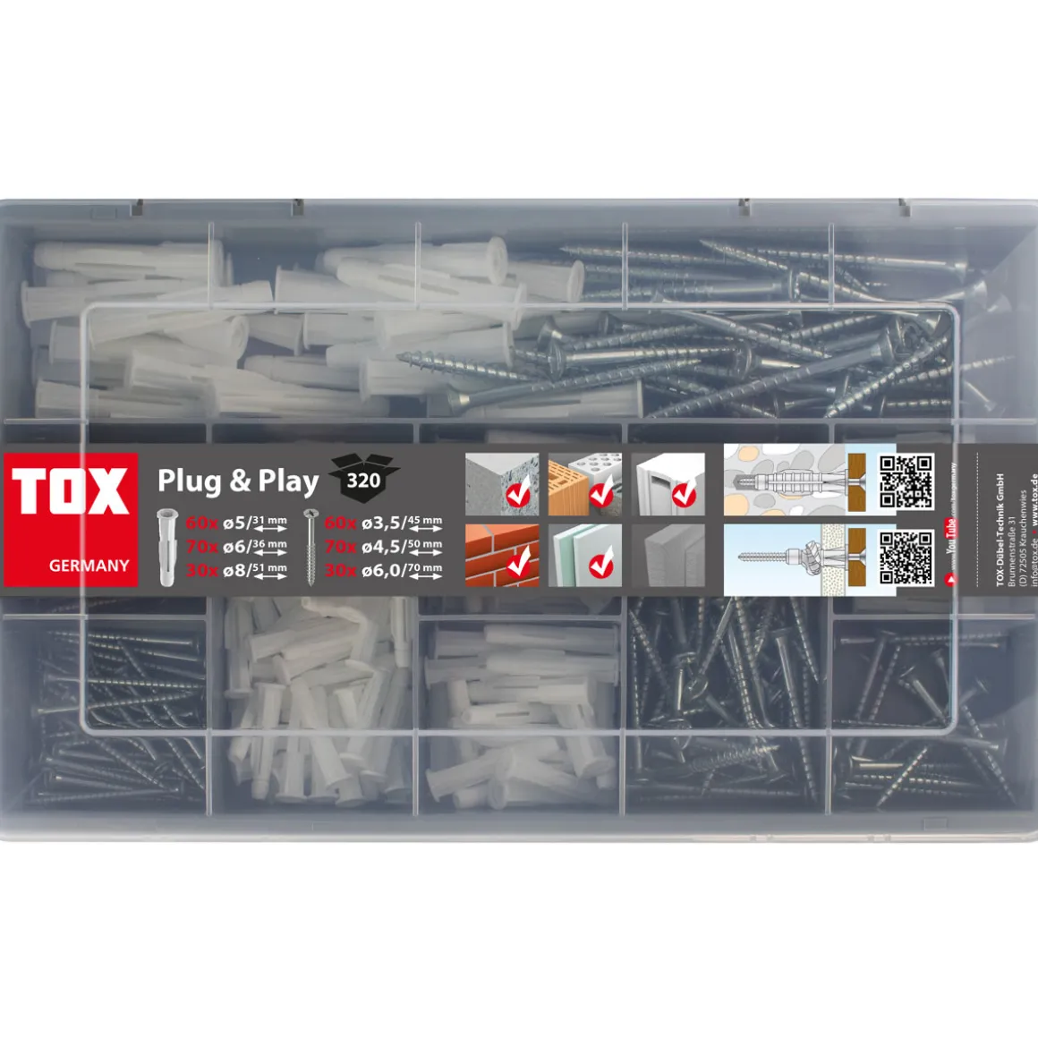 Mit der TOX Sortimentsbox Plug and Play haben Sie immer das passende Zubehör zur Hand. Die Box enthält insgesamt 320 Dübel und Schrauben aus Polypropylen und ist für eine Vielzahl von Untergründen geeignet.