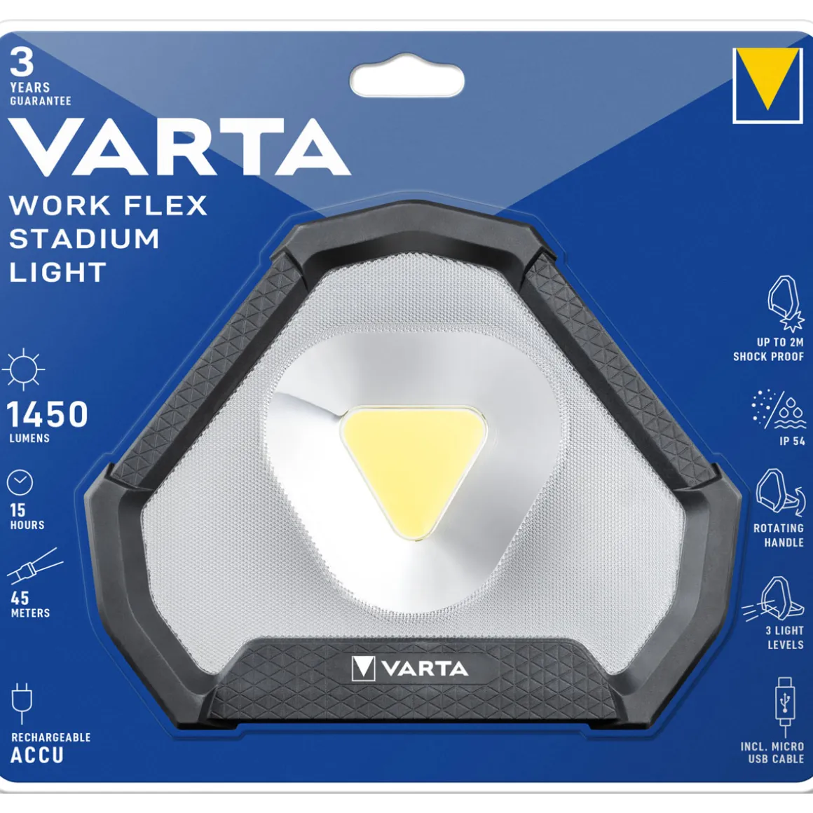 Die Varta LED-Arbeitsleuchte Work Flex Stadium Light ist eine robuste und leistungsstarke Arbeitslampe mit einer hohen Schutzklasse gegen Staub und Spritzwasser. Der integrierte Li-Ionen Akku ermöglicht eine lange Betriebsdauer ohne ständigen Batteriewechsel. Die Leistungsfähigkeit dieser Arbeitslampe wird Handwerker und Heimwerker gleichermaßen beeindrucken.