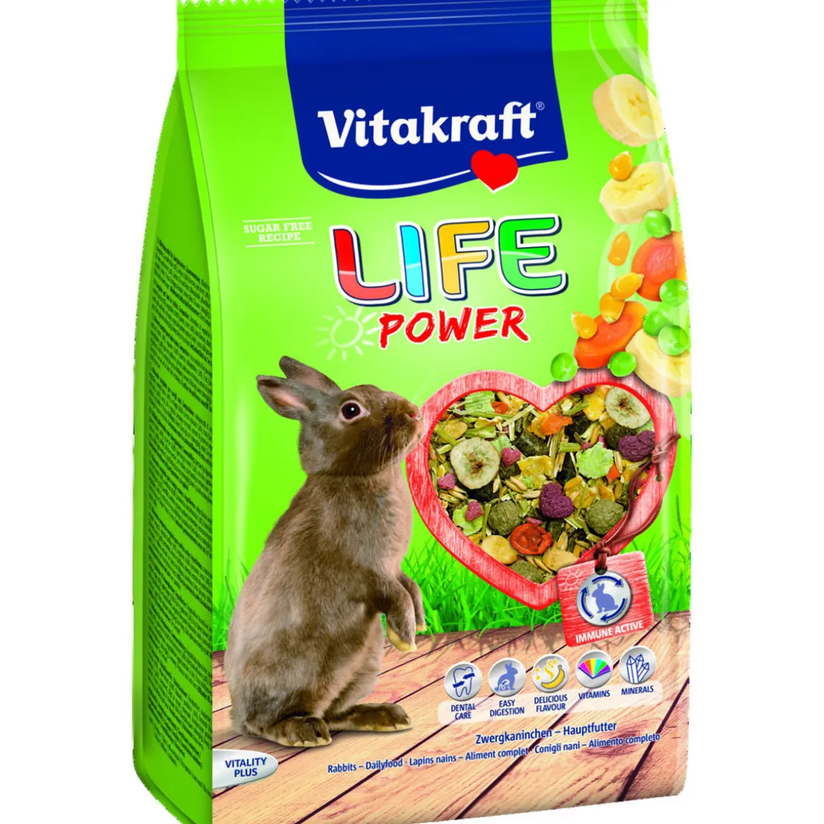 Diese kraftvolle Mischung bringt Power und Fitness in den Futternapf! Der leckere Mix für Zwergkaninchen enthält u. a. knackige Karotten für die Extraportion an Vitaminen und fruchtige Bananen als Lieferant für Energie und Mineralstoffe. Wertvolle Beta-Glucane stärken die Abwehrkräfte der Tiere, der gesunde Anteil an Rohfaser unterstützt zudem die Verdauung. Auch hilft die faserreiche Zusammensetzung der Mischung beim wichtigen Abrieb der stets nachwachsenden Nagerzähne. Von Nagerexperten und Tierärzten entwickelt!