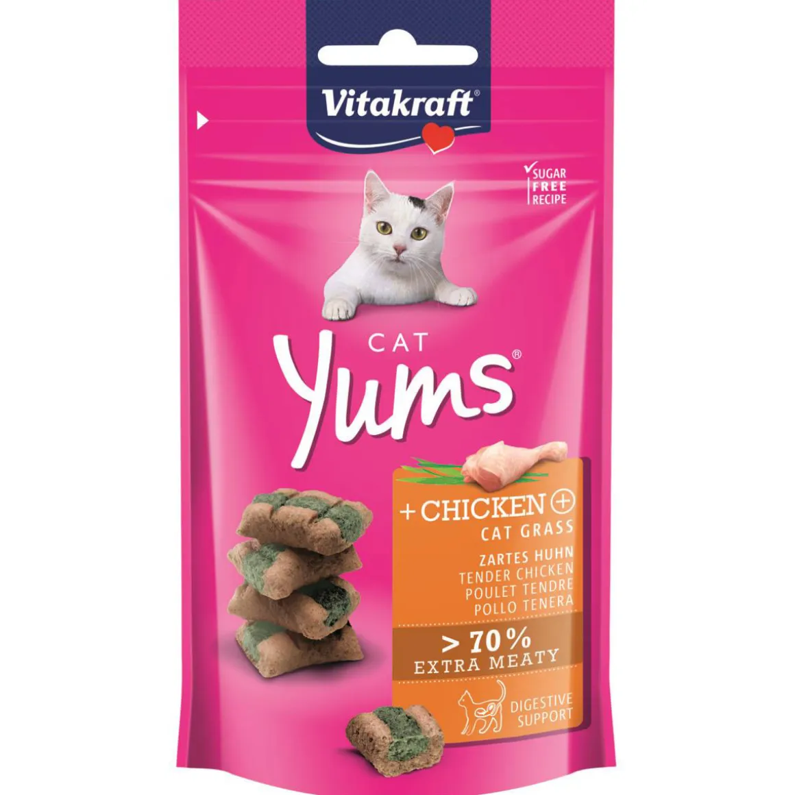 Mhmmm … yummy! Die extra fleischigen Cat Yums mit zartem Hühnchen und Katzengras werden in einem einzigartigen Verfahren hergestellt – mit besten Zutaten und nach zuckerfreier Rezeptur. Enthaltenes Inulin unterstützt eine gesunde Darmflora und damit auch das Wohlbefinden des Stubentigers.