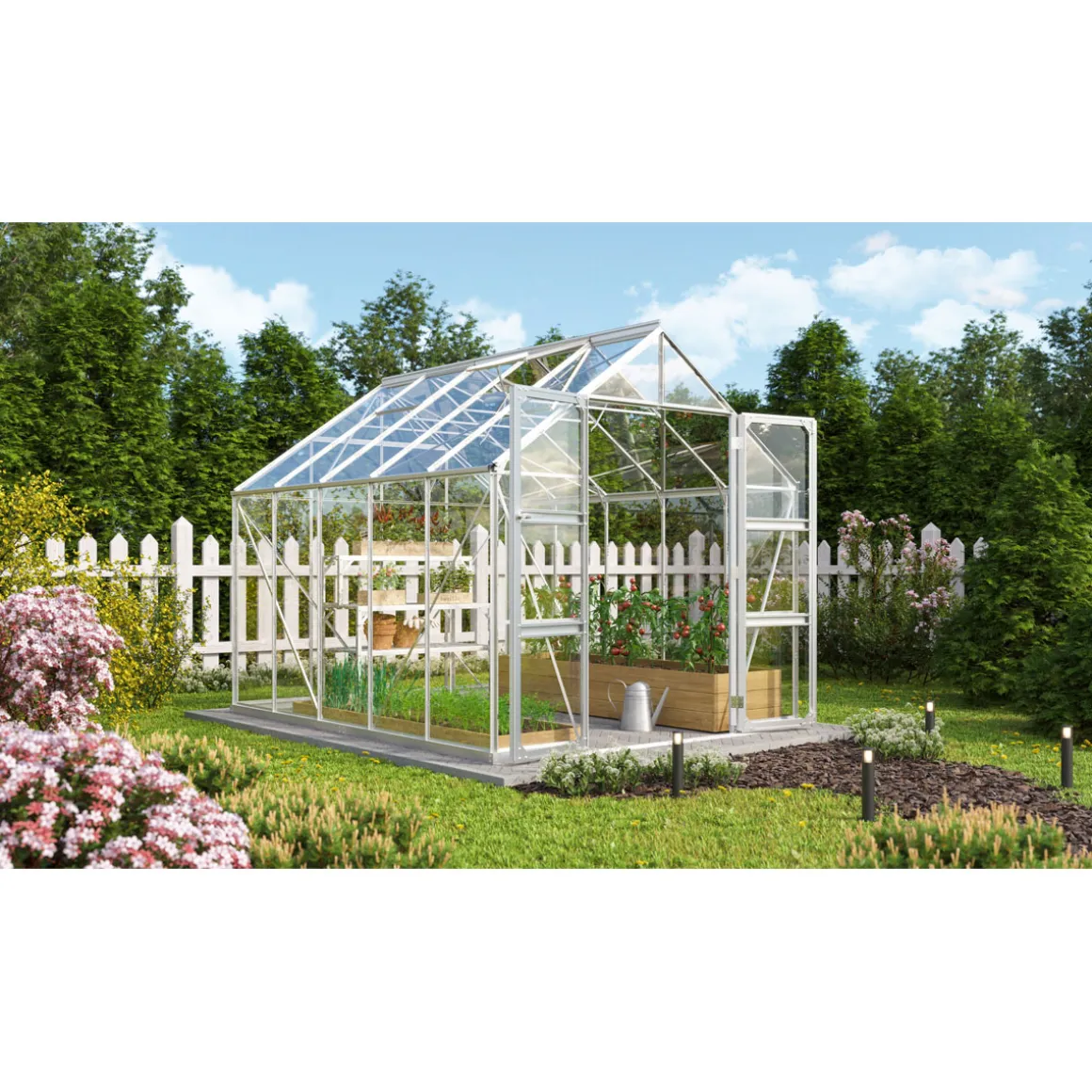 - Doppeltür mit bodentiefer Schwelle erleichtert den Transport von größeren Pflanzen oder Geräten