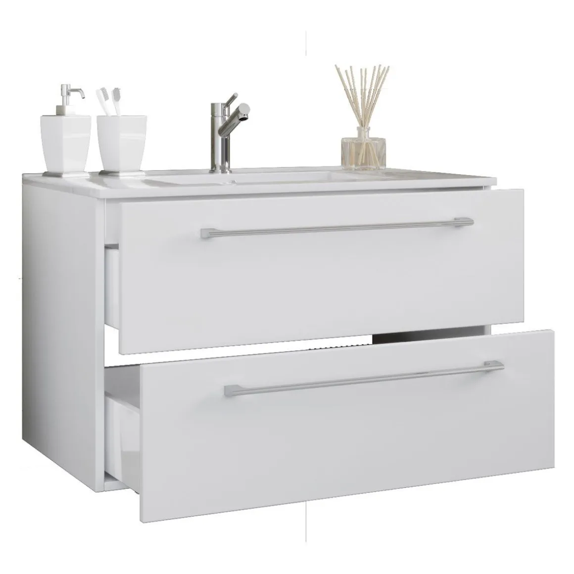 Das Badmöbel-Set besteht aus einem Unterschrank mit zwei Schubladen.Ein modernes Waschbecken aus massiver Keramik runden das Möbel ab, um den perfekten Blickfang im Badezimmer zu erhalten.Waschtisch-Unterschrank