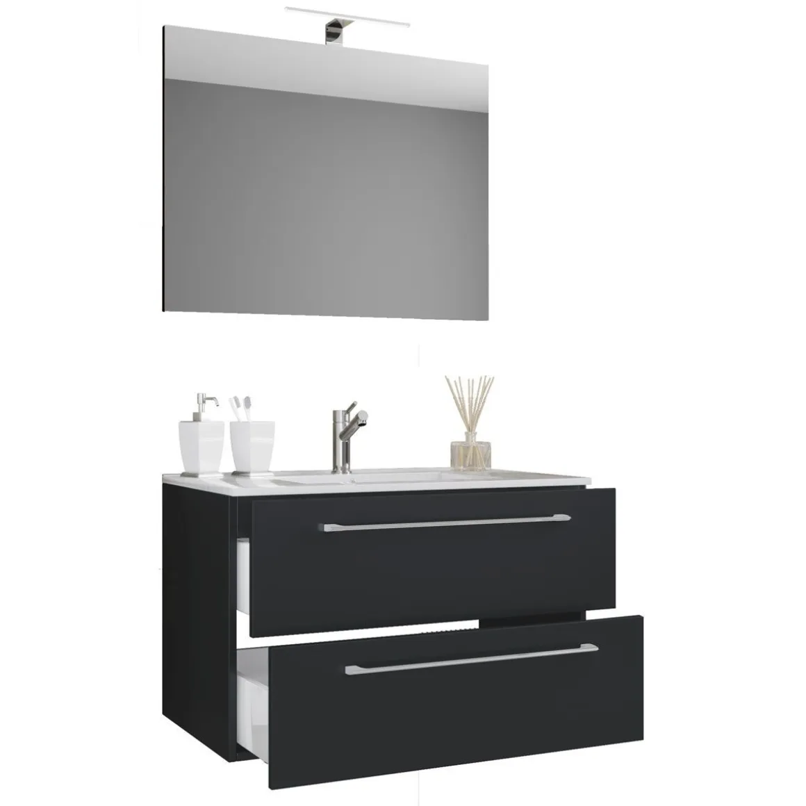 Das Badmöbel-Set besteht aus einem Unterschrank mit zwei Schubladen.Ein modernes Waschbecken aus massiver Keramik und einem Spiegel strapazierfähigem Glas runden das Möbel ab, um den perfekten Blickfang im Badezimmer zu erhalten.