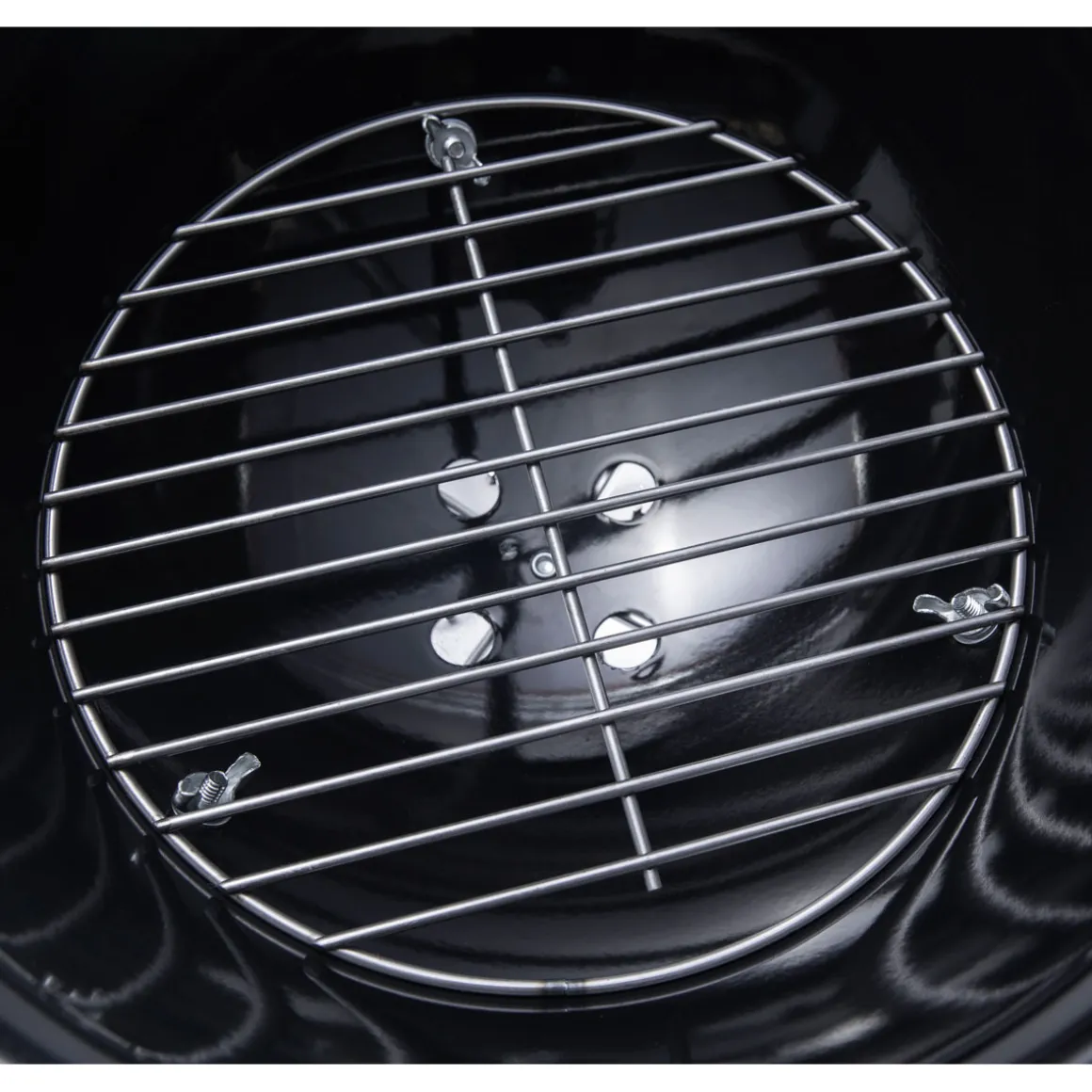 - Ausgestattet mit einem verchromten Stahl-Grillrost und regelbarer Luftzufuhr