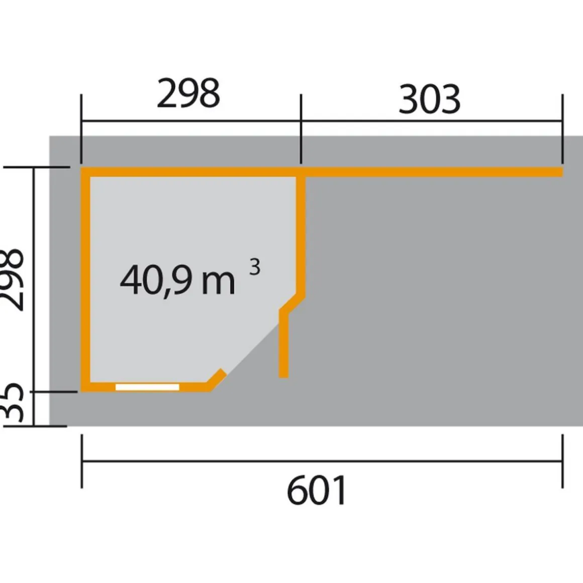 - Aufstellmaß (ohne Dach): 601 x 298 cm (B x T) = 17,91 m²
