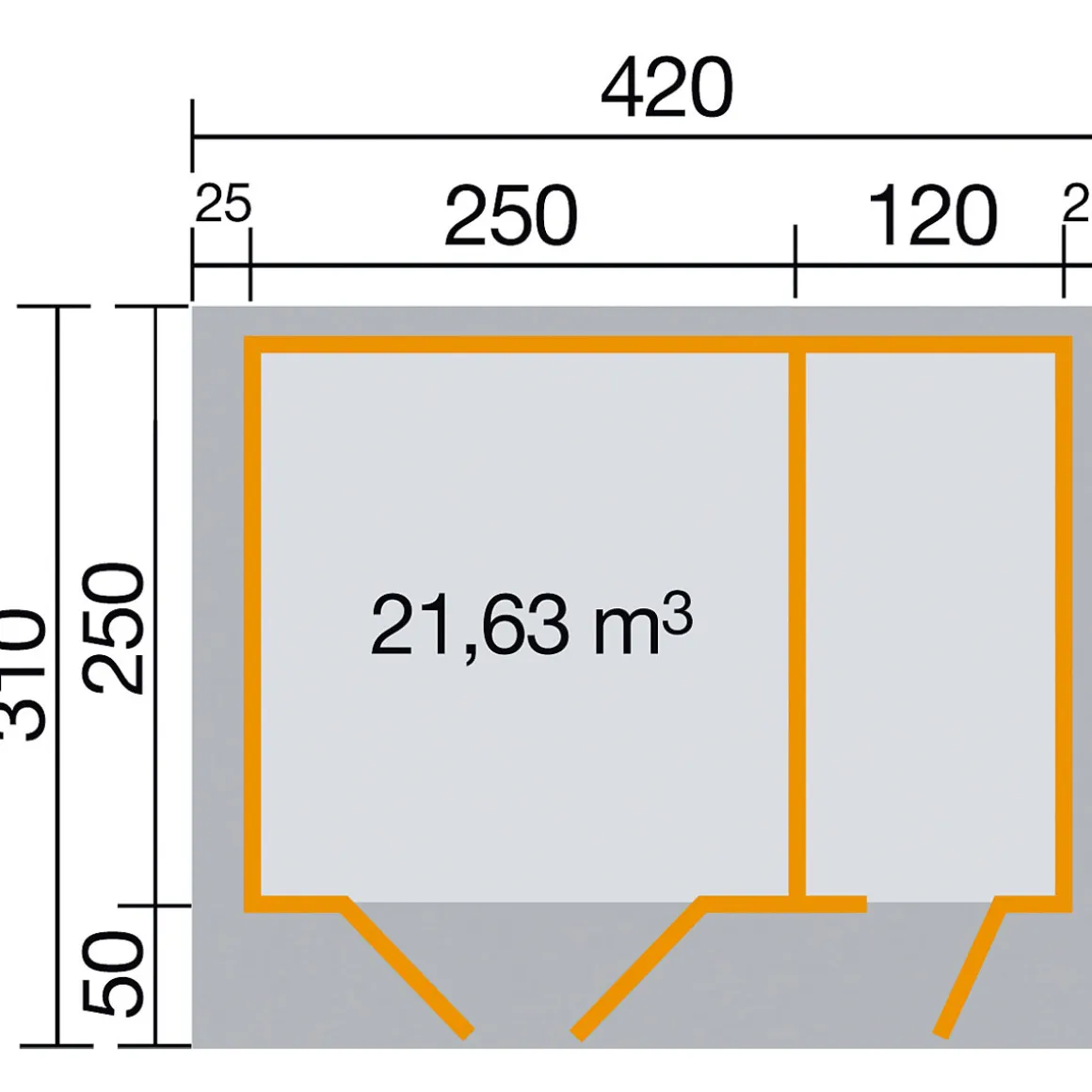 - – Außenmaße (BxLxH=Trauf) (cm): 370x250x270