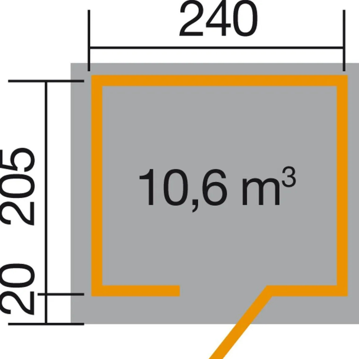 - Aufstellmaß (ohne Dach): 241 x 205 cm (B x T) = 4,9405 m²