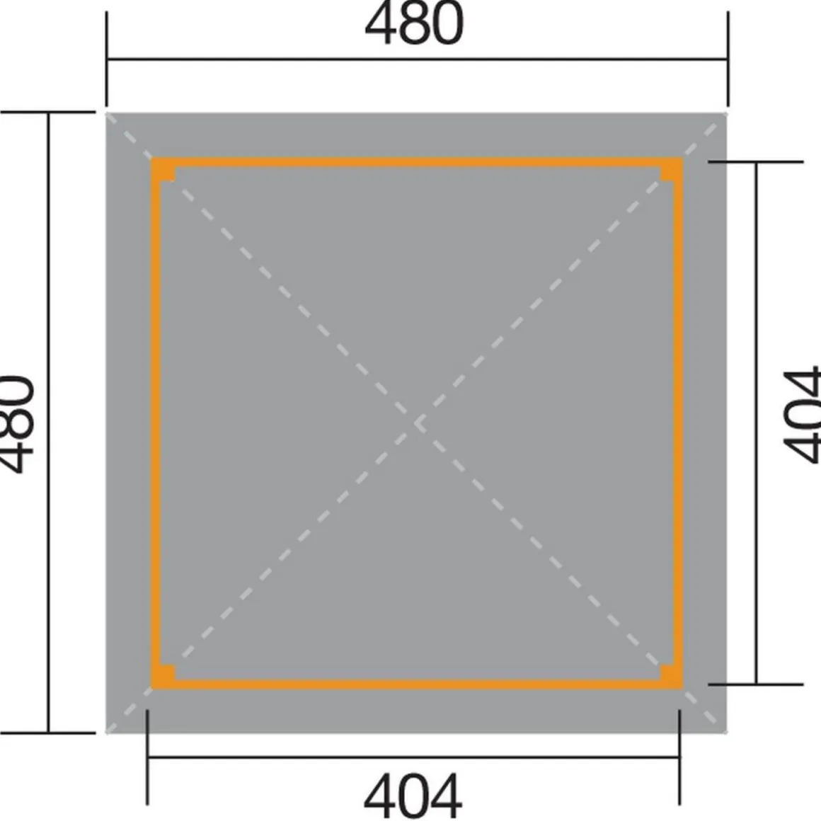 - Außenmaße von 480x480x204 cm (BxLxH=Trauf) und Innenmaße von 380×380 cm (BxL)