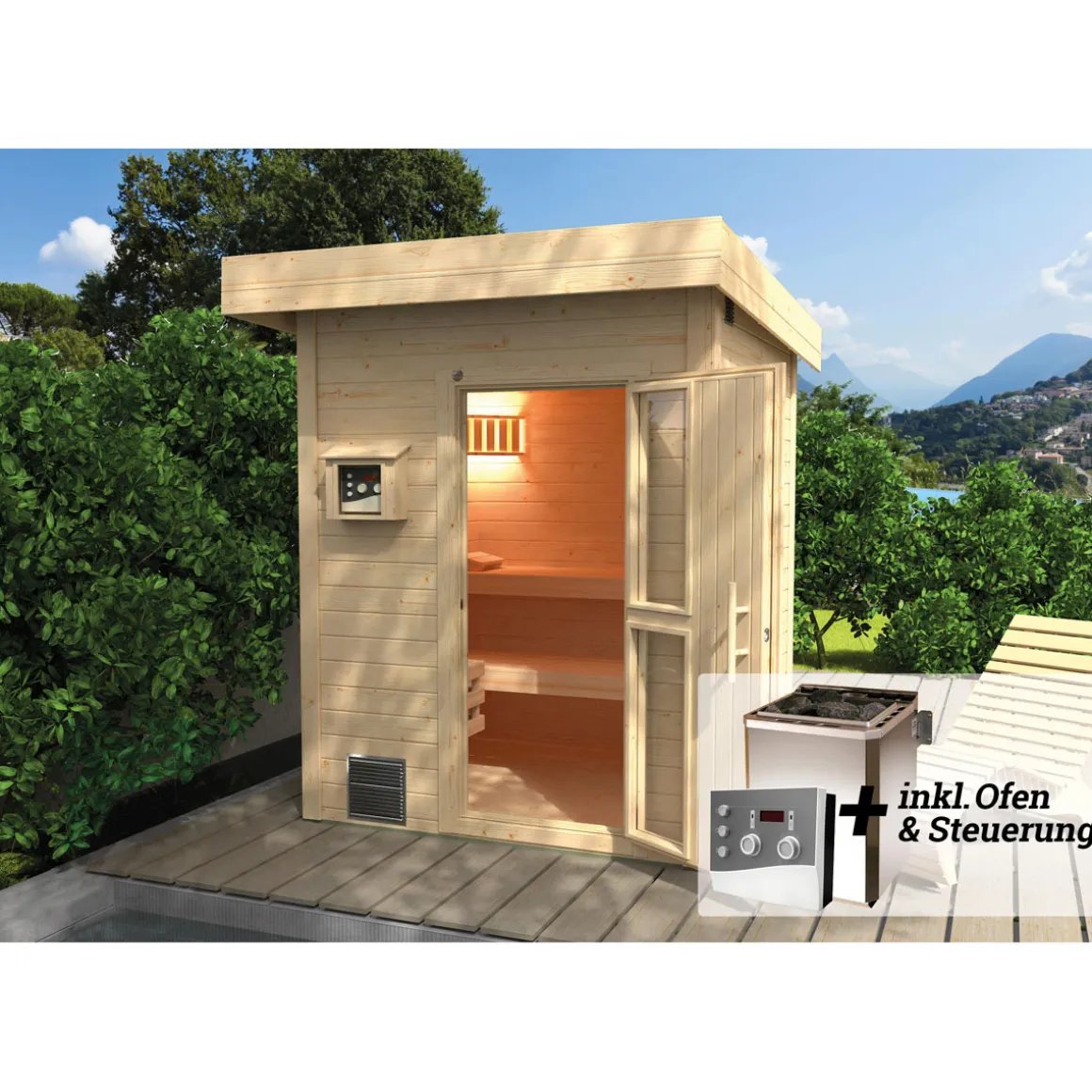 - Lieferumfang: Sauna, Ofen, Liegen, Saunasteine, Montageanleitung