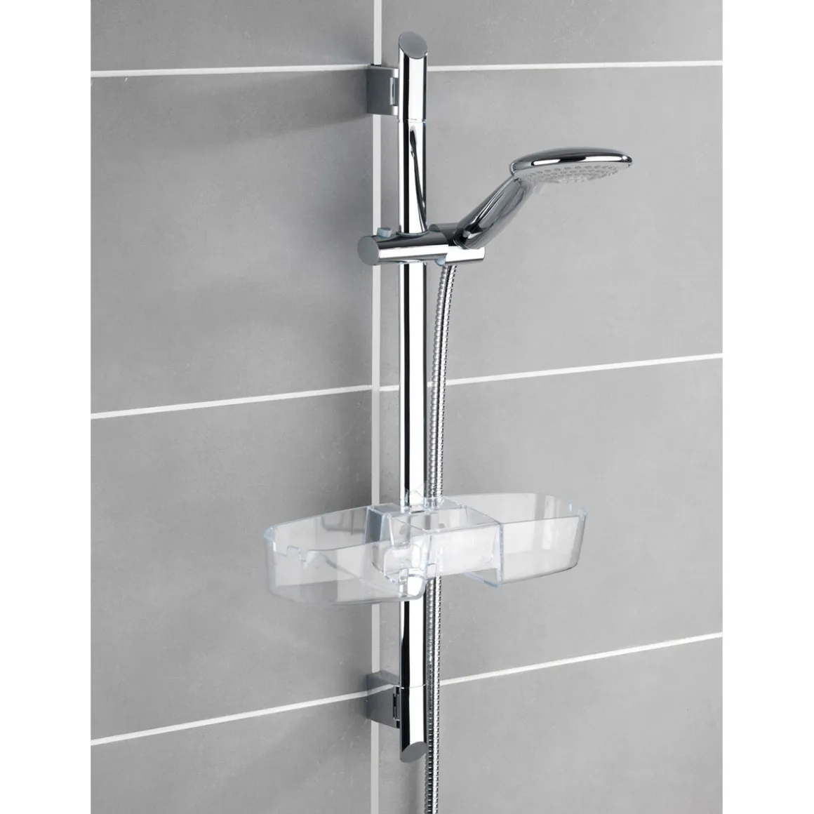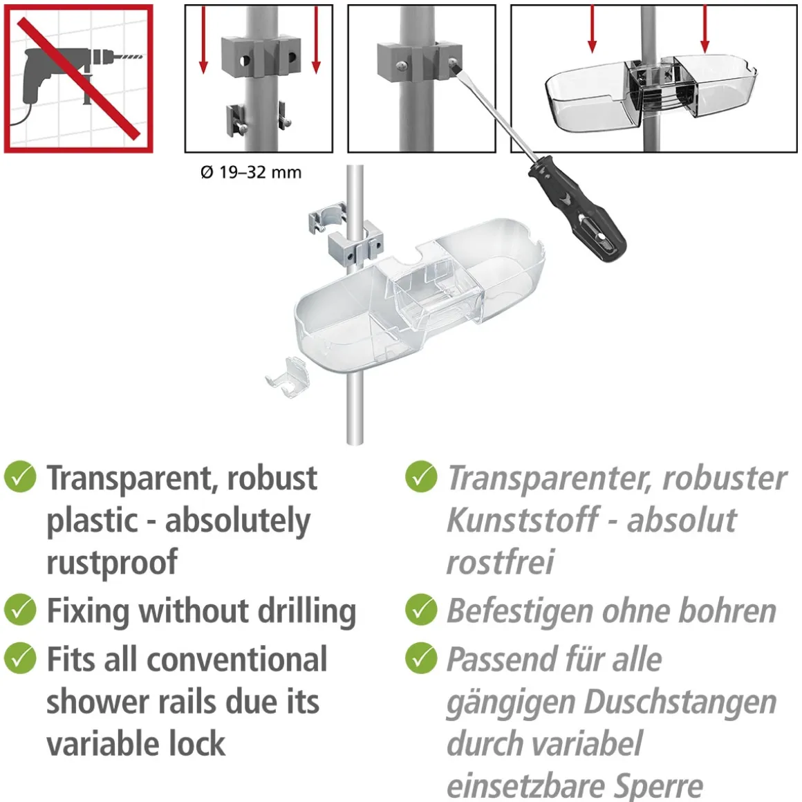 Mit dem Wenko Duschstangencaddy Premium wird die tägliche Duschroutine zum Erlebnis. Der transparente Caddy aus Polystyrol bietet mit seinen drei Fächern ausreichend Platz für Shampoo, Duschgel und weitere Pflegeprodukte. Die Montage ist kinderleicht und der Caddy passt auf alle gängigen Duschstangen.