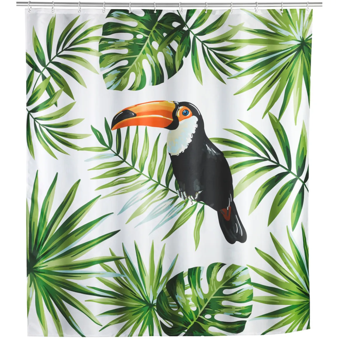 Bringen Sie mit dem Wenko Tucan Duschvorhang Farbe und Fröhlichkeit in Ihr Badezimmer. Der waschbare Vorhang ist aus hochwertigem Textil-Polyester gefertigt und wird inklusive 12 praktischen Duschvorhangringen geliefert.