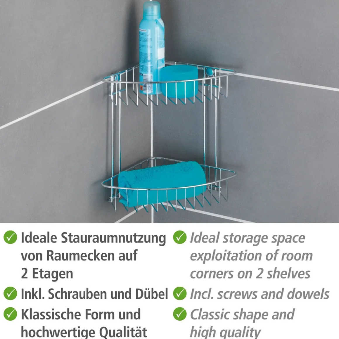 Das Wenko Eckregal Classic 2 Etagen ist die ideale Wahl, wenn Sie zusätzlichen Stauraum in Ihrem Badezimmer oder Ihrer Küche benötigen. Mit seiner verchromten Oberflächenbehandlung und dem klassischen Design fügt es sich nahtlos in jede Einrichtung ein.