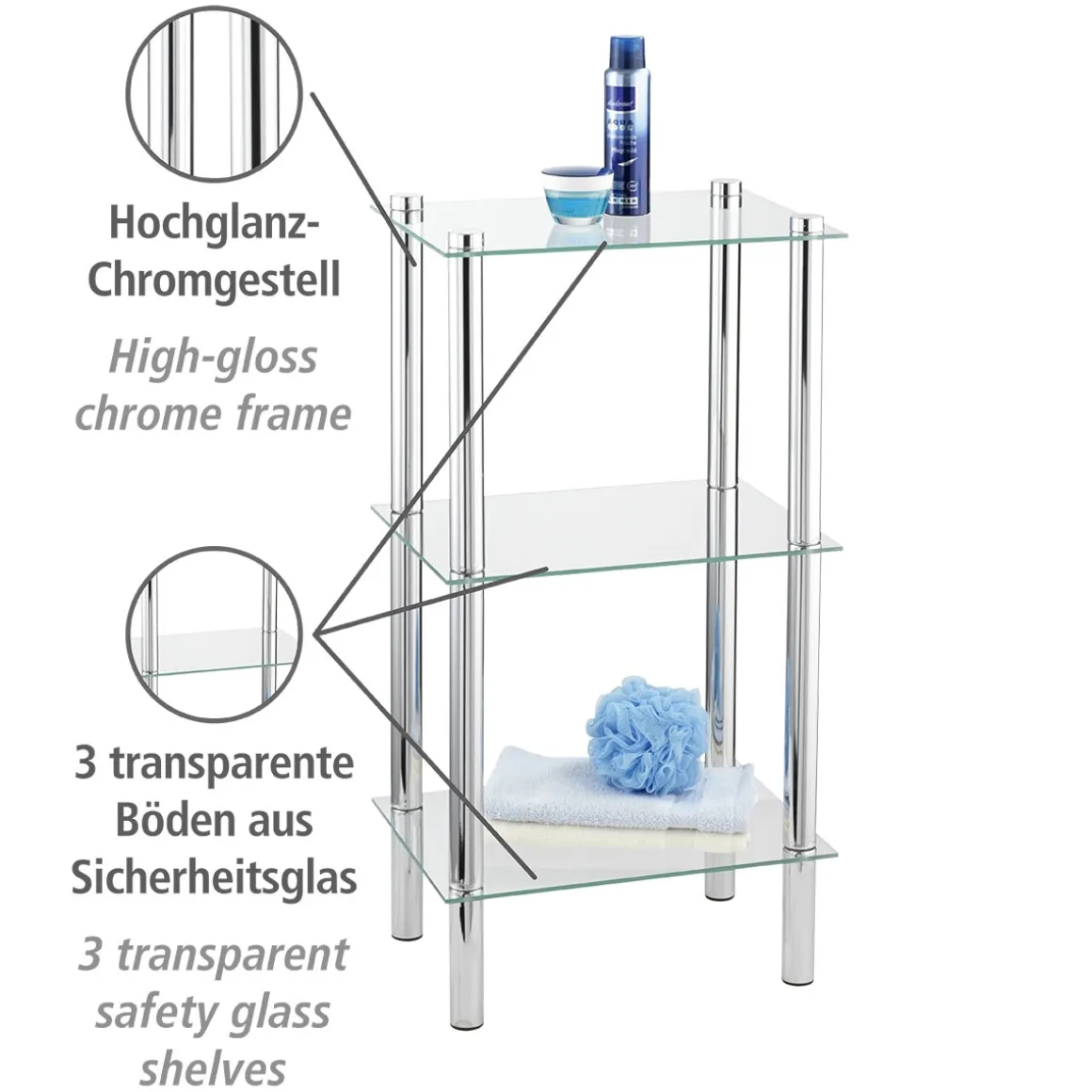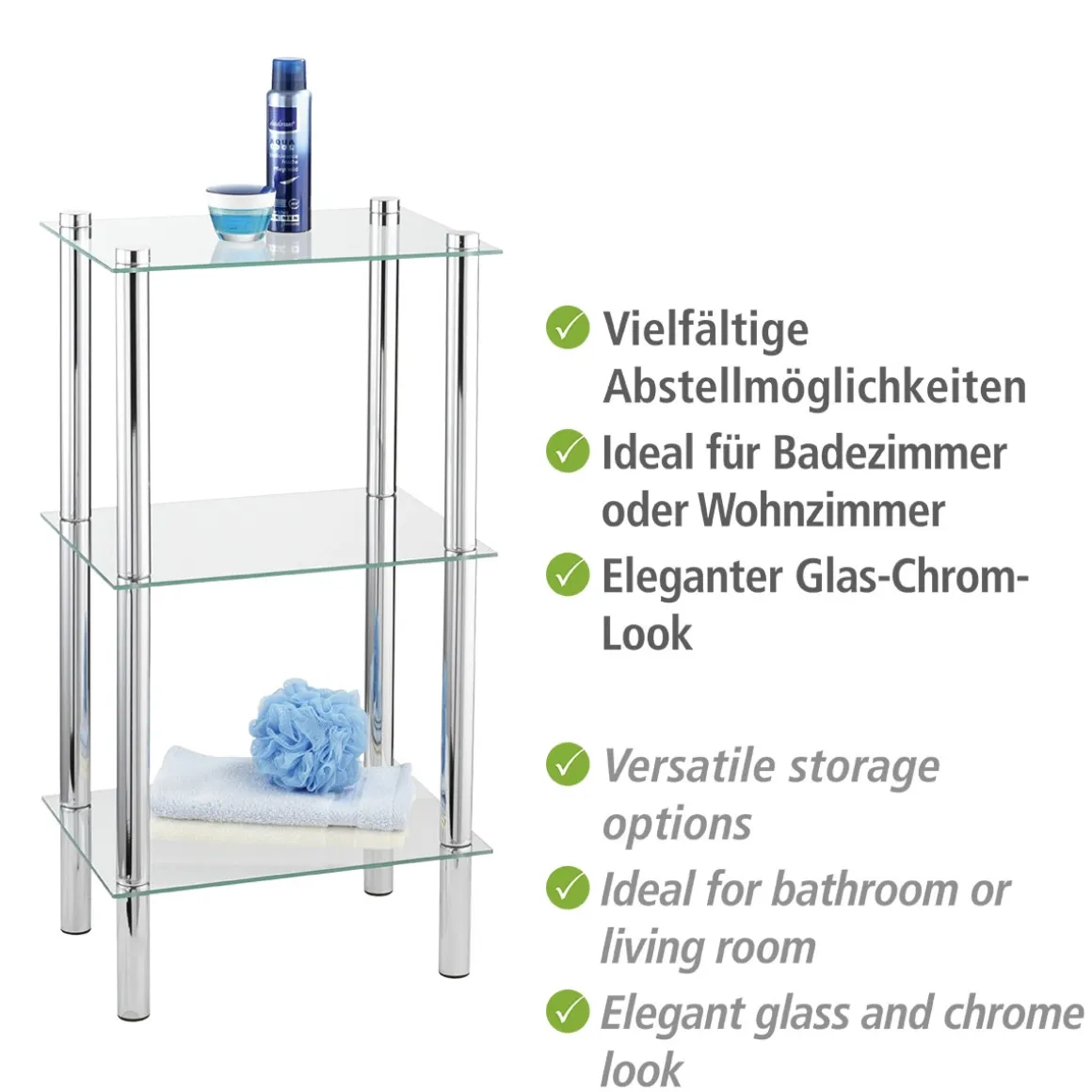 Mit dem Wenko Regal Yago erhalten Sie ein modernes Standregal, das nicht nur optisch ansprechend ist, sondern auch durch seine hochwertigen Materialien überzeugt. Die drei gehärteten Glasablagen bieten genügend Platz für Ihre Lieblingsdeko oder Badezimmerutensilien. Durch seinen Einsatz im Bad oder Wohnbereich wird es zu einem echten Hingucker in Ihrem Zuhause. Überzeugen Sie sich selbst von der Qualität des Wenko Regals Yago!