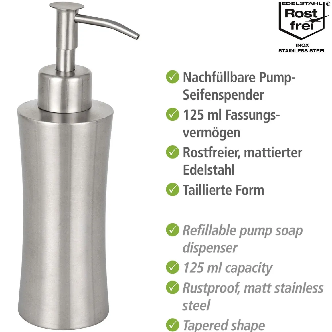 Mit dem Wenko Seifenspender Pieno holen Sie sich einen stilvollen und funktionalen Helfer ins Badezimmer. Das edle Design aus rostfreiem Edelstahl passt perfekt zu jeder Einrichtung und das Fassungsvermögen von 125 ml reicht für viele Anwendungen aus. Dank seiner einfachen Handhabung ist der Spender schnell nachgefüllt und einsatzbereit. Überzeugen Sie sich selbst von der Qualität des Produkts!