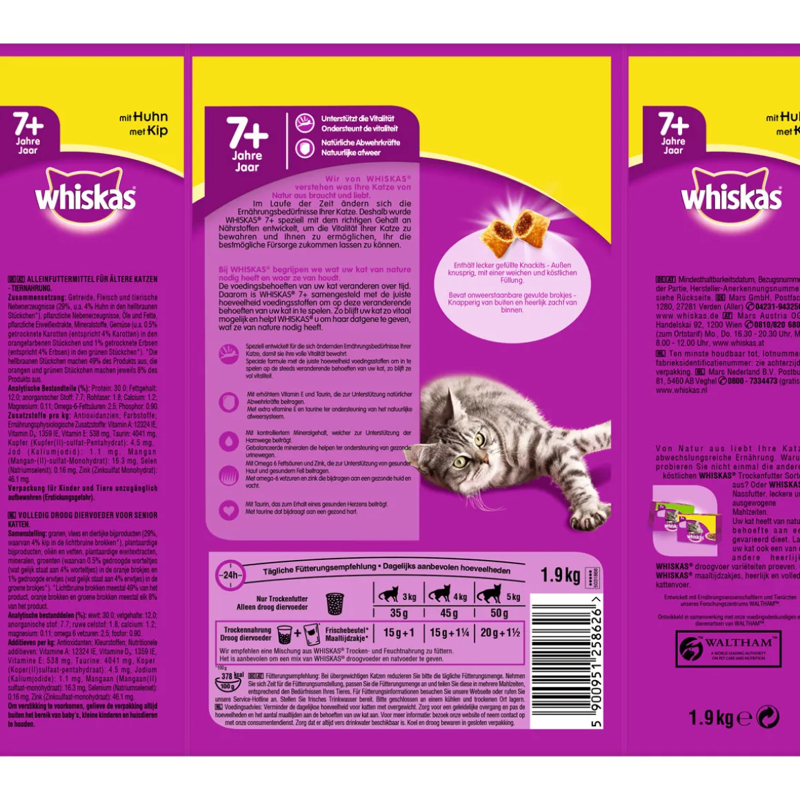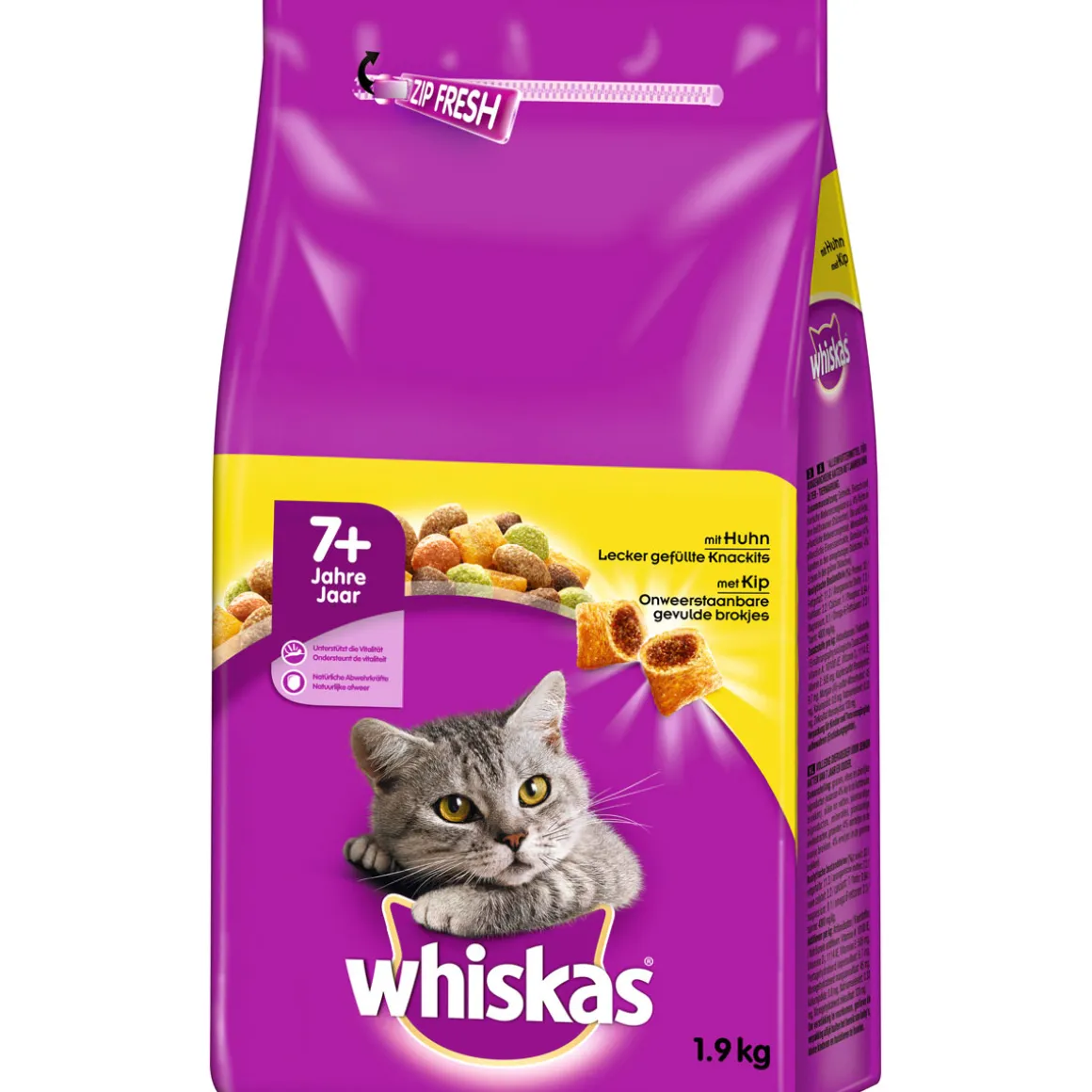 Wir von Whiskas® verstehen was Ihre Katze von Natur aus braucht und liebt. Im Laufe der Zeit ändern sich die Ernährungsbedürfnisse Ihrer Katze. Deshalb wurde Whiskas® 7+ speziell mit den richtigen Gehalt an Nährstoffen entwickelt, um die Vitalität Ihrer Katze zu bewahren und Ihnen zu ermöglichen Ihr die bestmögliche Fürsorge zukommen lassen zu können. Enthält lecker gefüllte Knackits® – Außen knusprig, mit einer weichen und köstlichen Füllung.