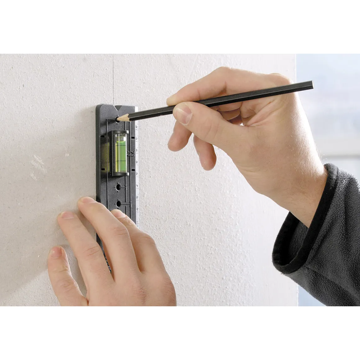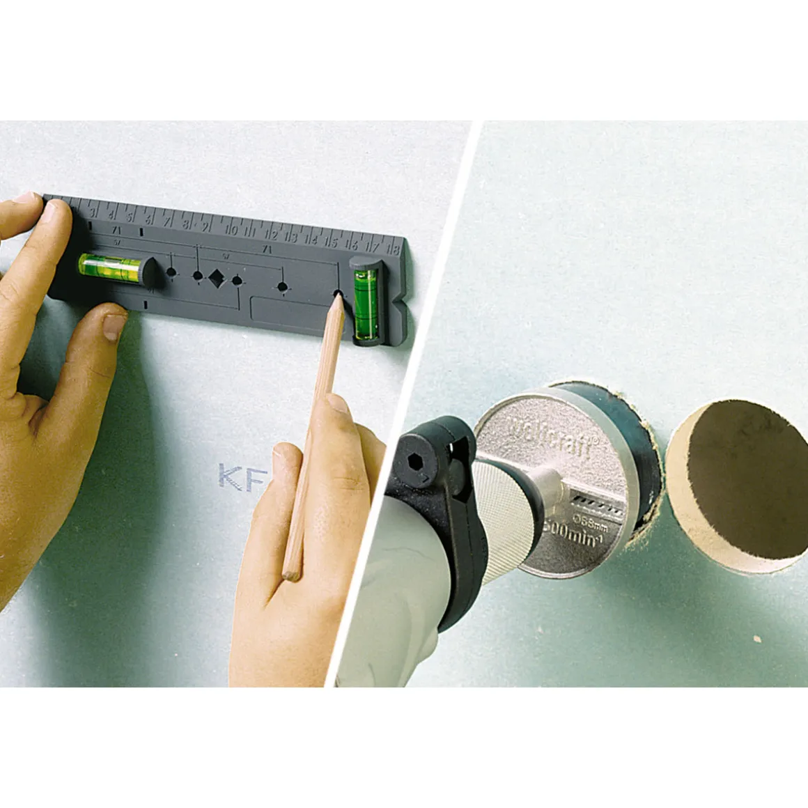 Mit der Wolfcraft Schablone für Hohlwanddosen wird das Bohren von Löchern in Gipskarton- oder Trockenbauwänden zum Kinderspiel. Die Schablone ist aus robustem Kunststoff gefertigt und verfügt über zwei Libellen, die eine exakte Ausrichtung ermöglichen.